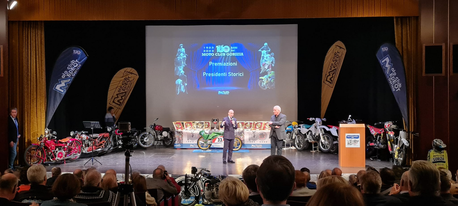 Il Moto Club Pino Medeot ha festeggiato i 100 anni di attività. Nel teatro Kulturni Dom si sono ripercorsi i 100 anni di attività motociclistica tra filmati e foto d’epoca.
